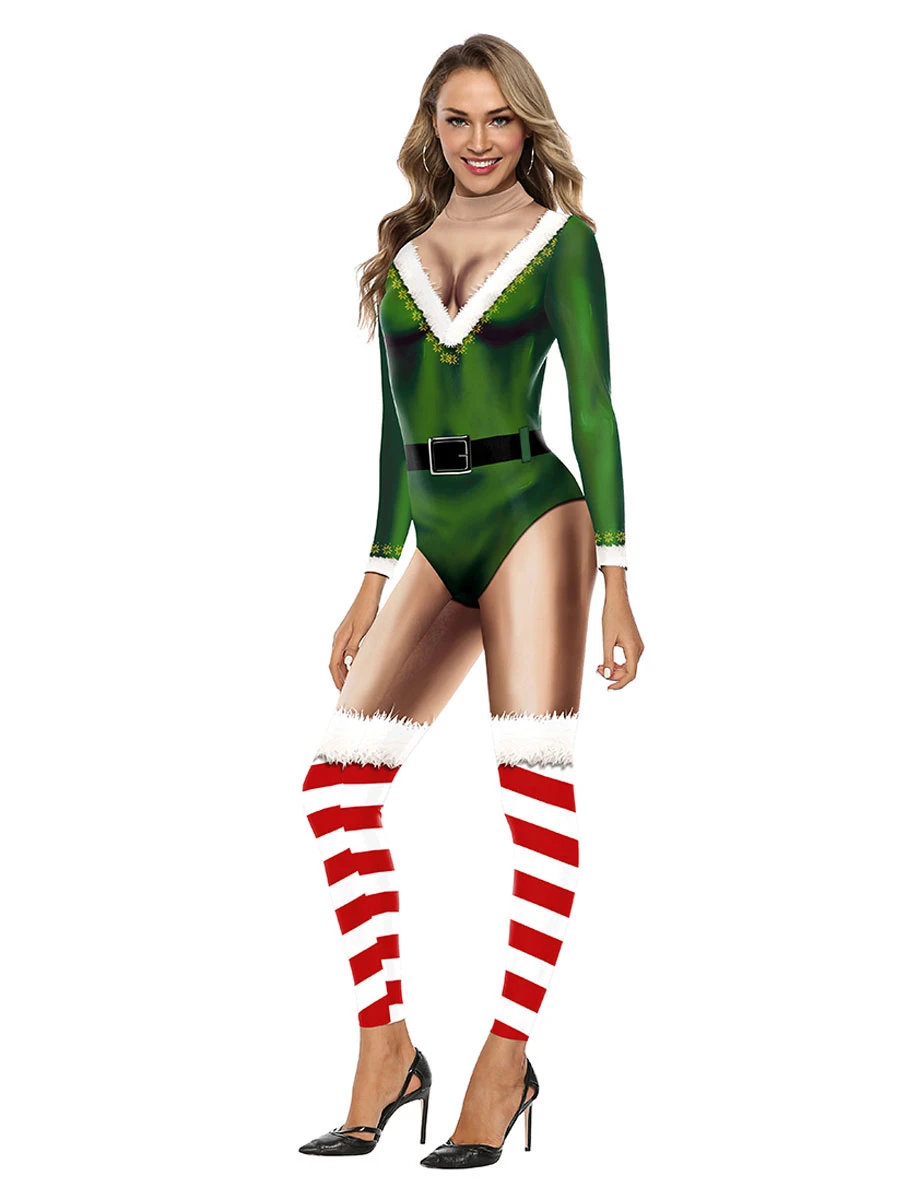 Women Christmas Costume Green Polyester Fiber Dress Hat Color Block Holidays Costumes Full Set
