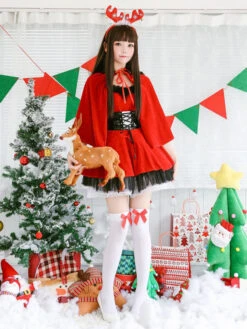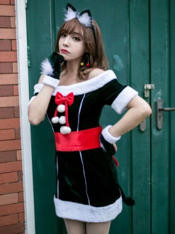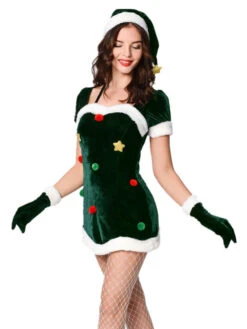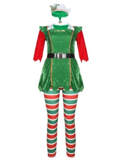 Women Christmas Costume Green Polyester Fiber Dress Hat Color Block Holidays Costumes Full Set
