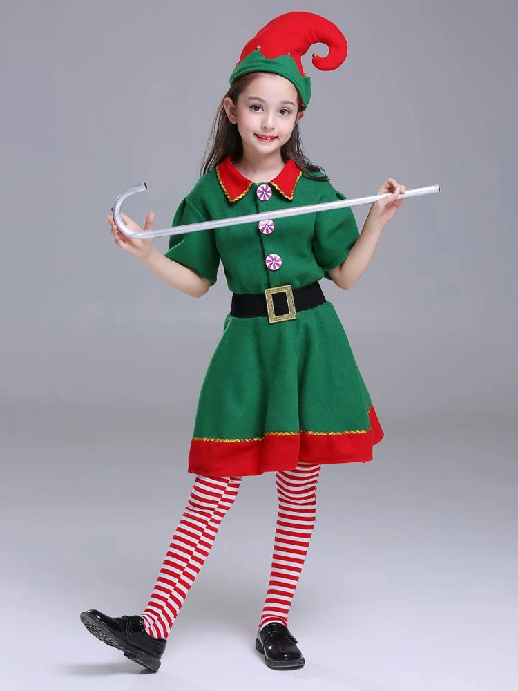Women Christmas Costume Green Polyester Fiber Dress Hat Color Block Holidays Costumes Full Set