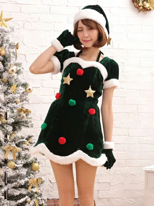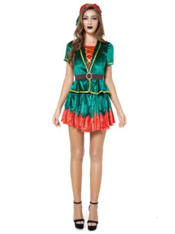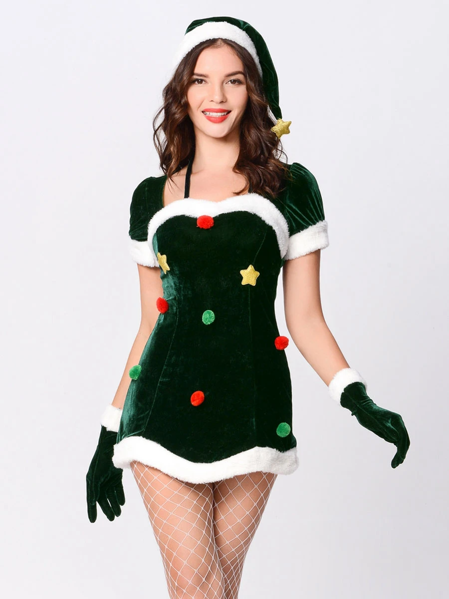 Women Christmas Costume Green Polyester Fiber Dress Hat Color Block Holidays Costumes Full Set